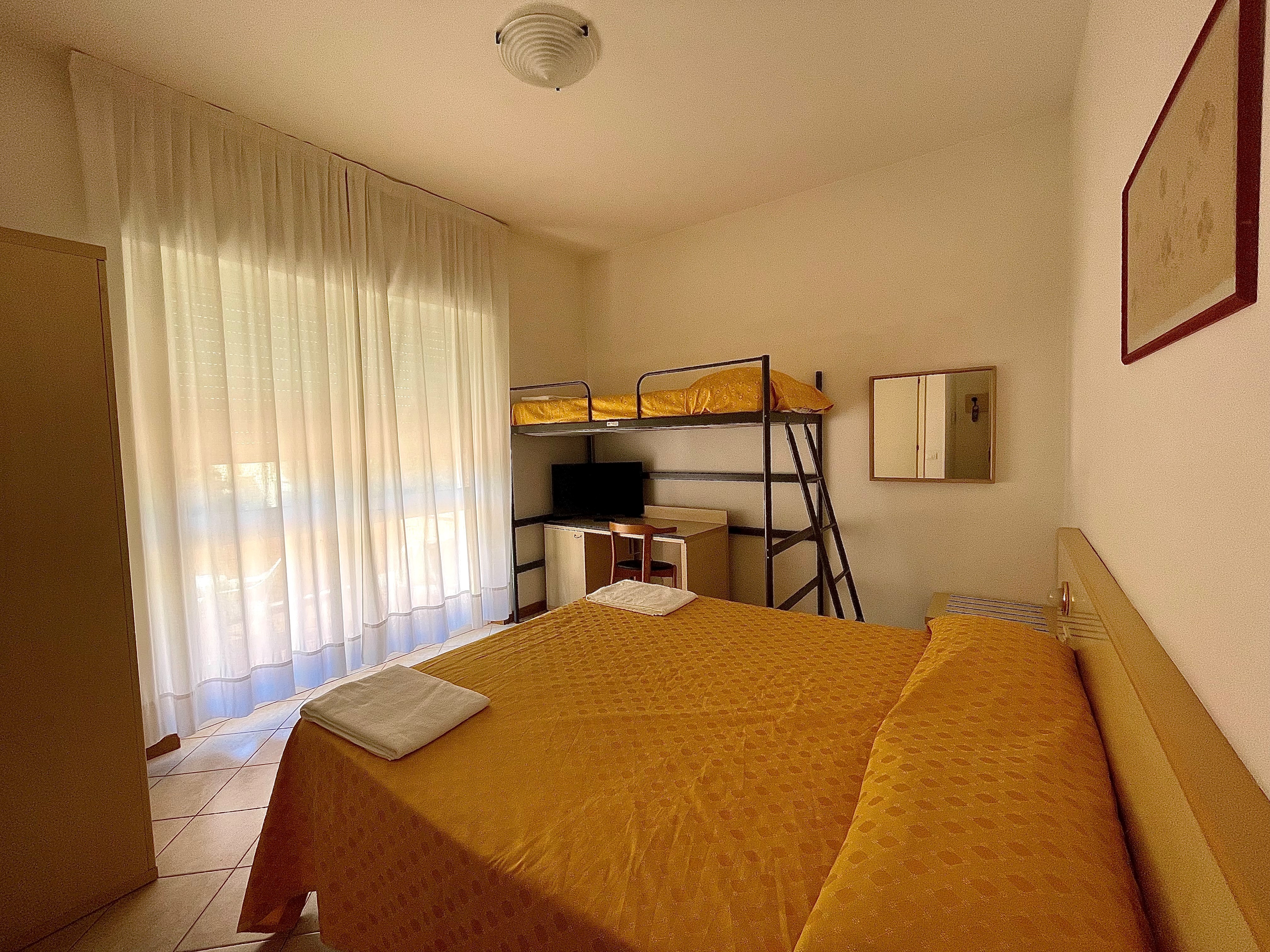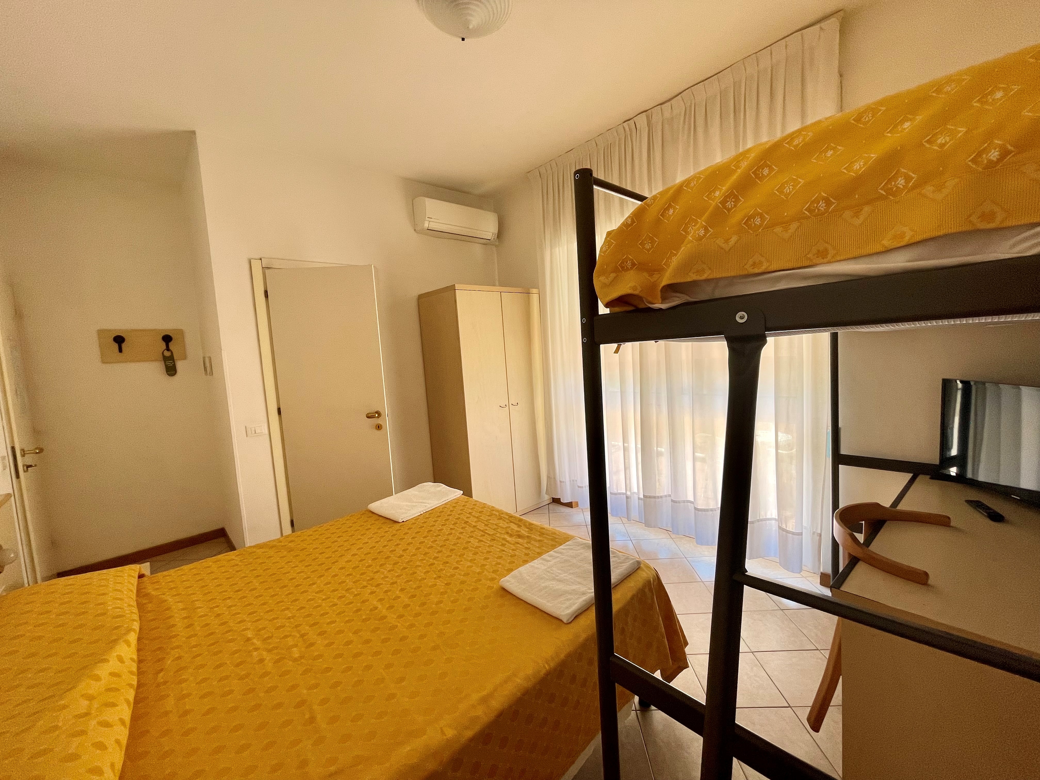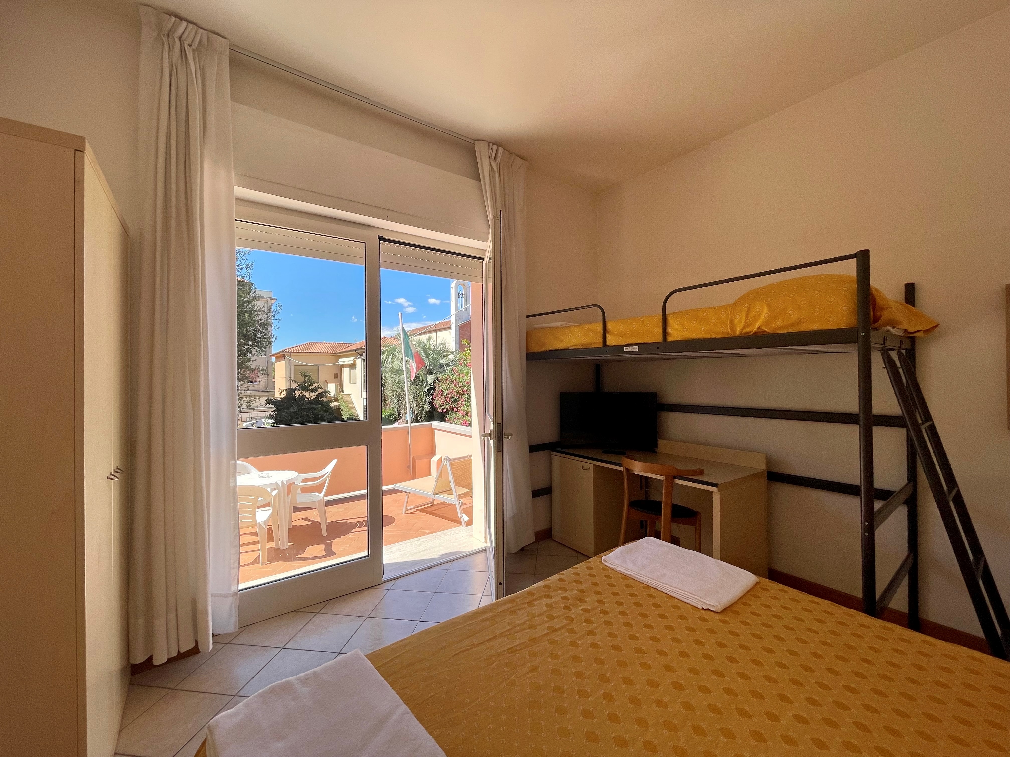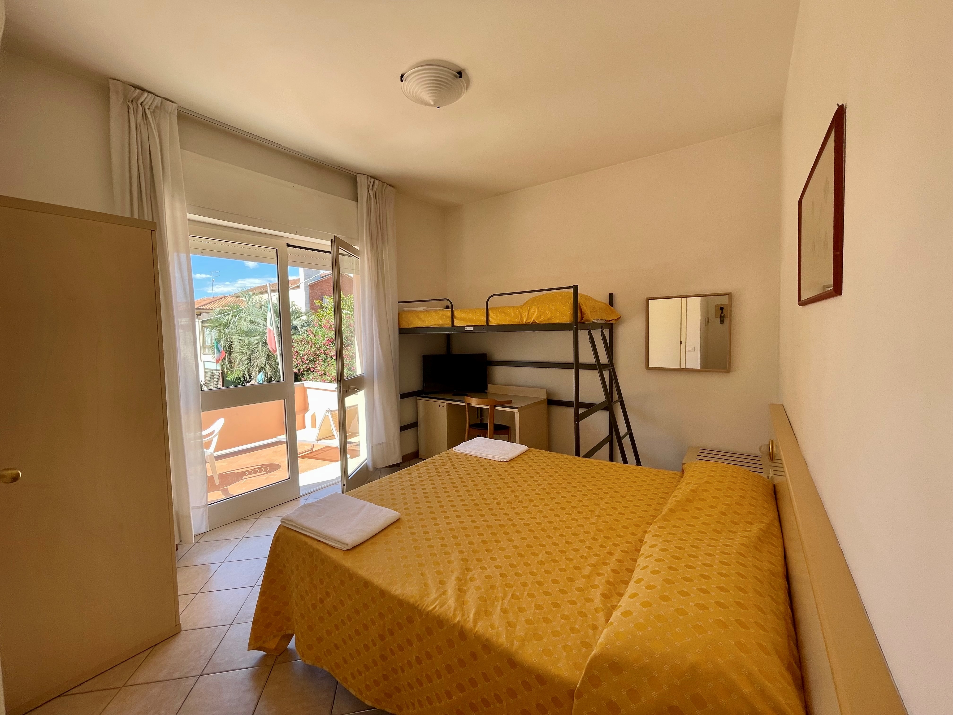 semplice e accogliente (letto matrimoniale + letto a castello), questa camera ospita una piccola famiglia composta da 2 genitori e 2 figli oppure 4 amici o amiche che decidono di passare le vacanze nel litorale. Dotata di tutti i servizi. Include un set di cortesia. Balcone con supplemento.  Non tutte le camere quadruple sono provviste di balcone